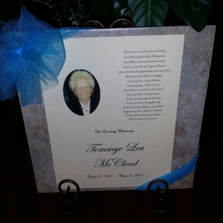 A keepsake of your loved one on a 12 x 12 porcelain tile. Complete with photo (s), and wording of your choice. Includes metal easel, so it's ready to be displayed.